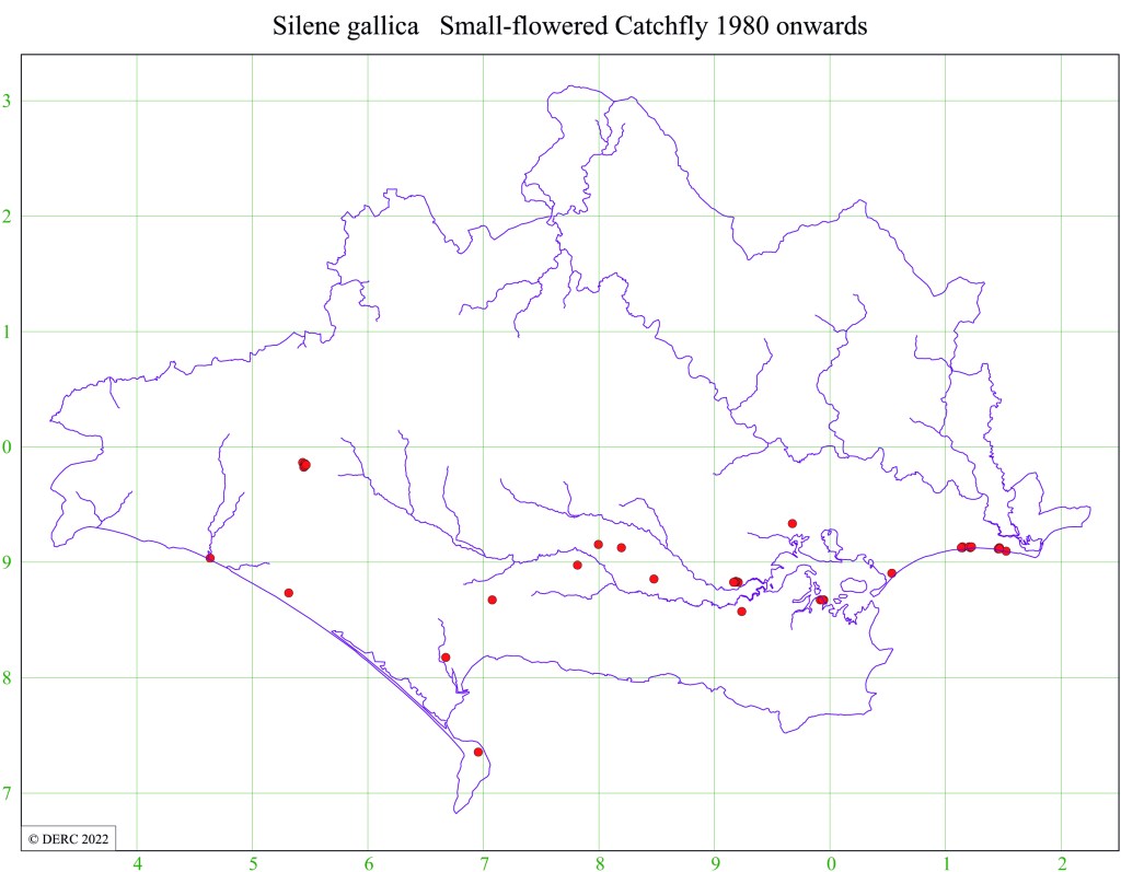 The maps below shows the distribution of Small-flowered Catchfly (Silene gallica) in the 1930s, a species described by Good as casual and found in 61 of the stands. It now can only be found in a handful of sites within the county. The fact that Good was not rigorous in his search for this species indicates that its decline has been drastic. A similar rate of decline is apparent for many other species of arable weed.